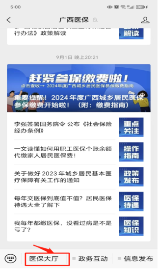 第一步:关注广西医保微信公众号,并进入“医保大厅”。