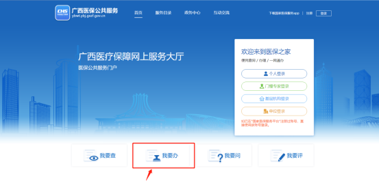 第一步:进入广西医保公共服务网站网上服务大厅(网址:https://ybwt.ybj.gxzf.gov.cn/),点击“我要办”。