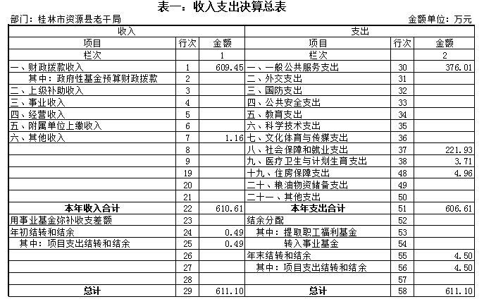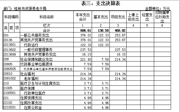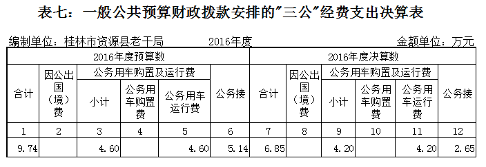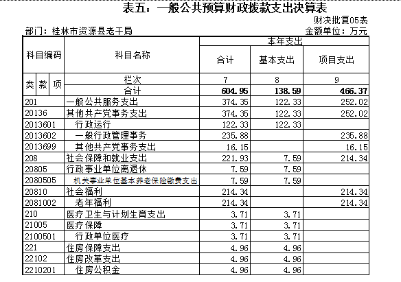 资源县老干局2016 年度一般公共预算支出604.95万元,其中:基本支出138.59万元,项目支出466.37万元。