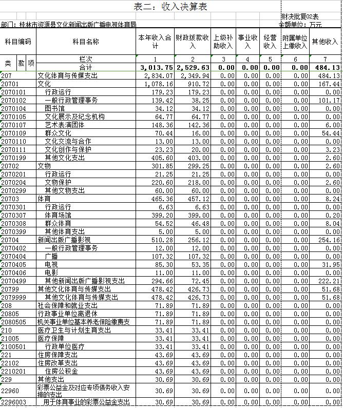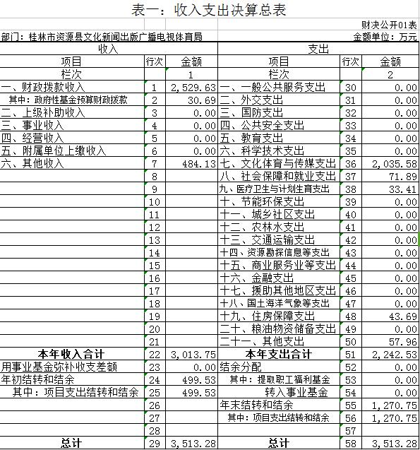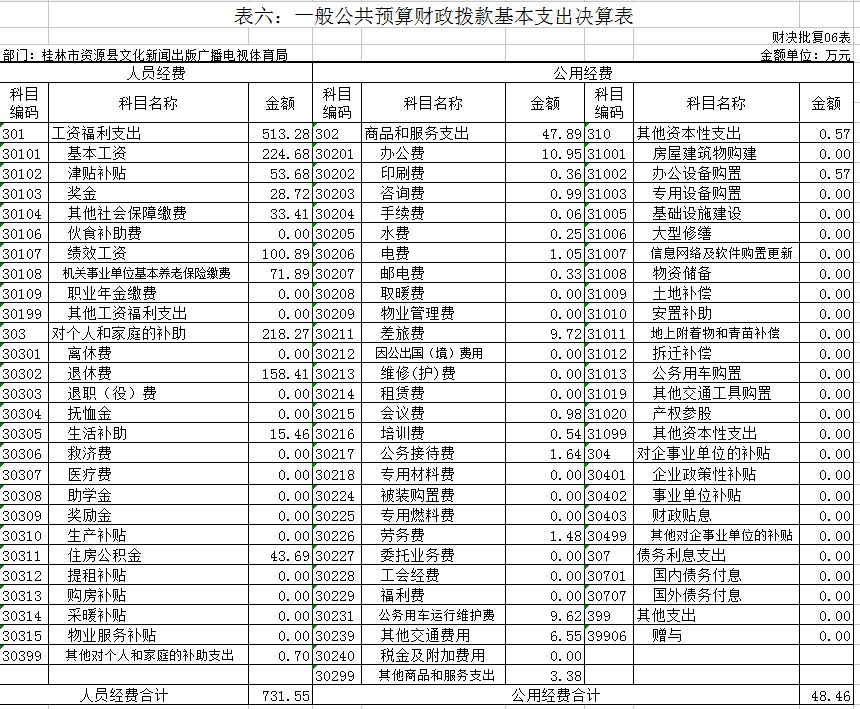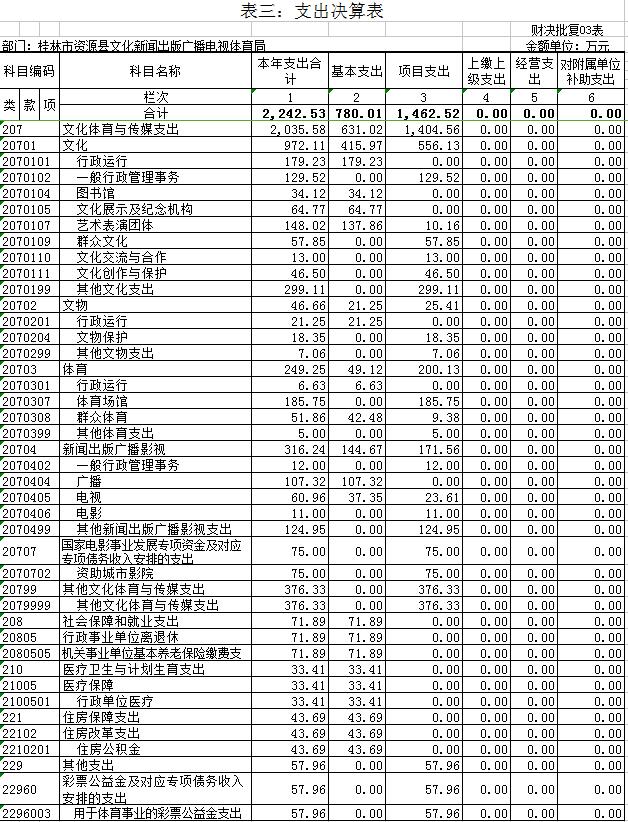 资源县文新广体局设行政单位1个;参公事业单位1个,财政核拨事业单位6个。参公事业单位是资源县文化市场综合执法大队,财政核拨事业单位分别是:资源县文化馆、资源县图书馆、资源县非物传承保护和农村文艺服务中心、资源县文物所、资源县业余体校,资源县广播站 。资源县文化新闻出版广播电视体育局和资源县文化市场综合执法大队单位基本支出列入《2017年政府收支分类科目》支出功能科目“2070101行政运行(文化)”。资源县文化馆单位基本支出列入《2017政府收支分类科目》支出功能科目“2070105文化展示及纪念机构”。资源县非物传承保护和农村文艺服务中心单位基本支出列入《2017年政府收支分类科目》支出功能科目“2070107艺术表演团体”。资源县图书馆单位基本支出列入《2016年政府收支分类科目》支出功能科目“2070104图书馆”。资源县业余体校基本支出列入《2017年政府收支分类科目》支出功能科目“2070308群众体育”。资源县文物管理所基本支出列入《2017年政府收支分类科目》支出功能科目“2070201行政运行(文物)”。资源县广播站基本支出列入《2016年政府收支分类科目》支出功能科目“2070404 广播 ”,资源县有线电视站、资源县有线电视器材站基本支出列入《2016年政府收支分类科目》支出功能科目“2070405 电视 ”。