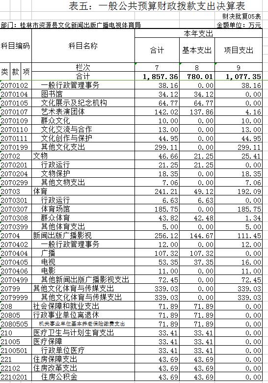 资源县文化新闻出版广播电视体育局2016 年度一般公共预算支出1857.36 万元,其中:基本支出780.01万元,项目支出1077.35万元。