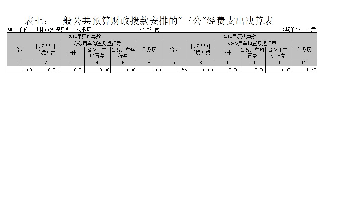 2016年度一般公共预算财政拨款安排的“三公”经费支出决算中,公务用车运行费支出决算0万元;公务接待费支出决算1.56万元。具体情况如下: