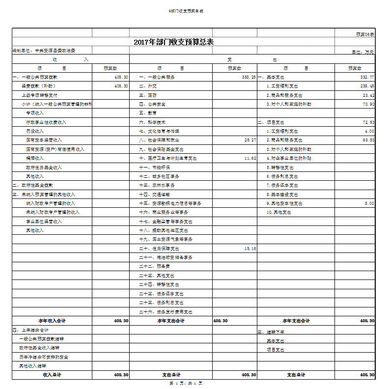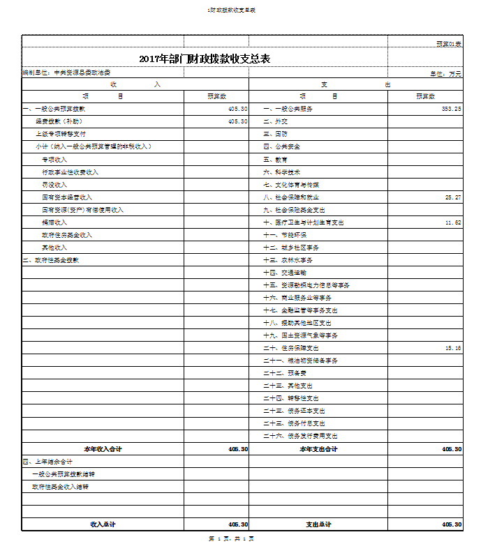 按照综合预算的原则,我单位所有收入和支出均纳入部门预算管理。我单位2017年全口径预算收支405.3万元,收入预算中:一般公共预算当年拨款收入405.3万元;政府性基金预算当年拨款收入0万元;未纳入预算管理的其他收入0万元,其他收入0万元,上年结转0万元。2017年支出总计405.3万元,其中:一般公共服务353.25万元;社会保障和就业25.27万元;医疗卫生与计划生育支出11.62万元;住房保障支出 15.16万元。