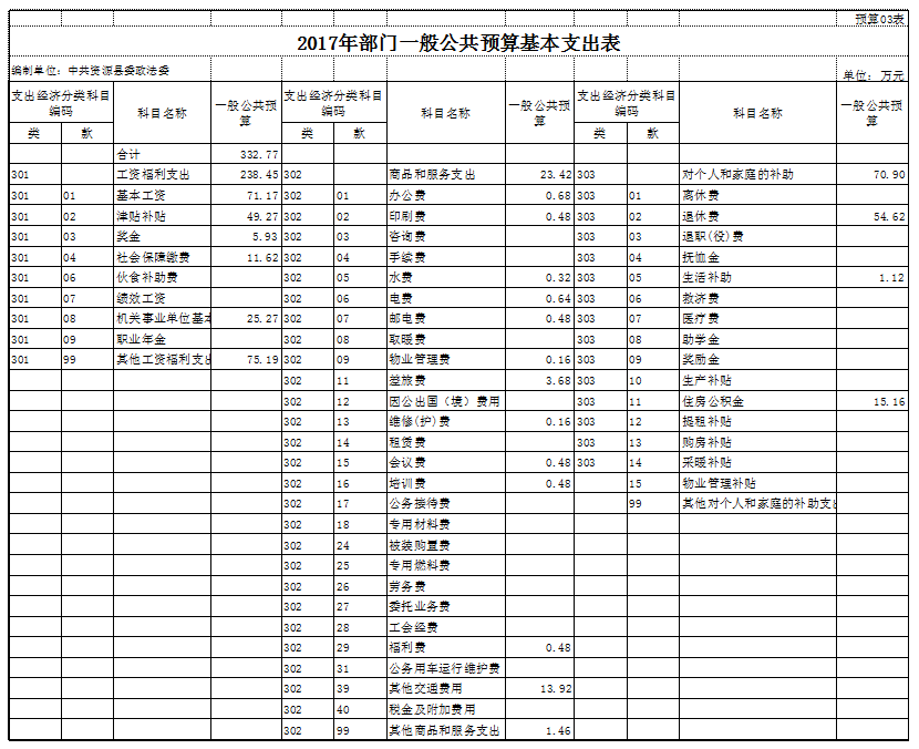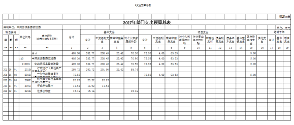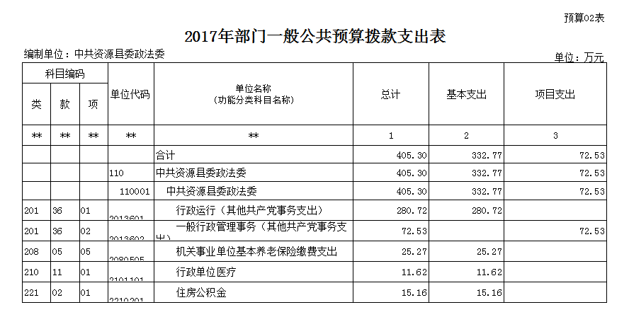 2017年度支出预算405.3万元,包括:基本支出332.77万元,占支出预算82.11%,其中:工资福利支出238.45万元,商品和服务支出23.42万元,对个人和家庭的补助70.9万元;项目支出72.53万元,占支出预算17.89%。