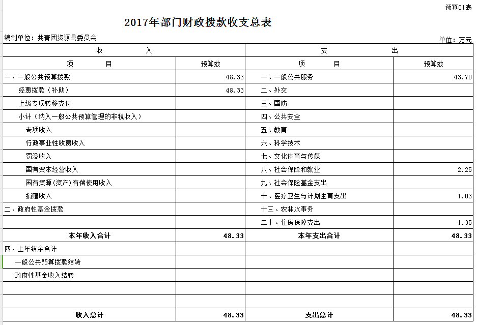 我单位2017年财政拨款收支预算 48.33 万元。收入预算中:一般公共预算拨款 48.33 万元,政府性基金预算拨款收入 0 万元,上年结转结余 0 万元。支出包括:一般公共服务 43.70 万元;社会保障和就业 2.25 万元;医疗卫生与计划生育支出1.03 万元,住房保障支出1.35万元。