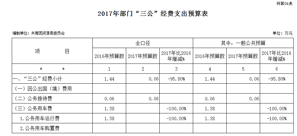 资源县团委2017年部门预算安排 “三公”经费预算合计 0.06万元,比上年预算减少1.38万元,下降 95.80 %。其中: