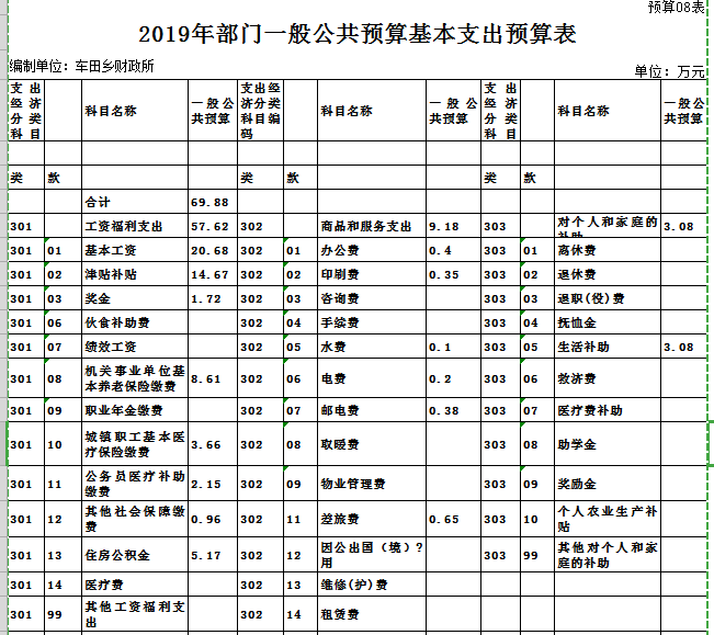 一般公共预算基本支出预算69.88万元,占支出总预算85.34%,同比减少3.09万元,降低4.23%。其中: