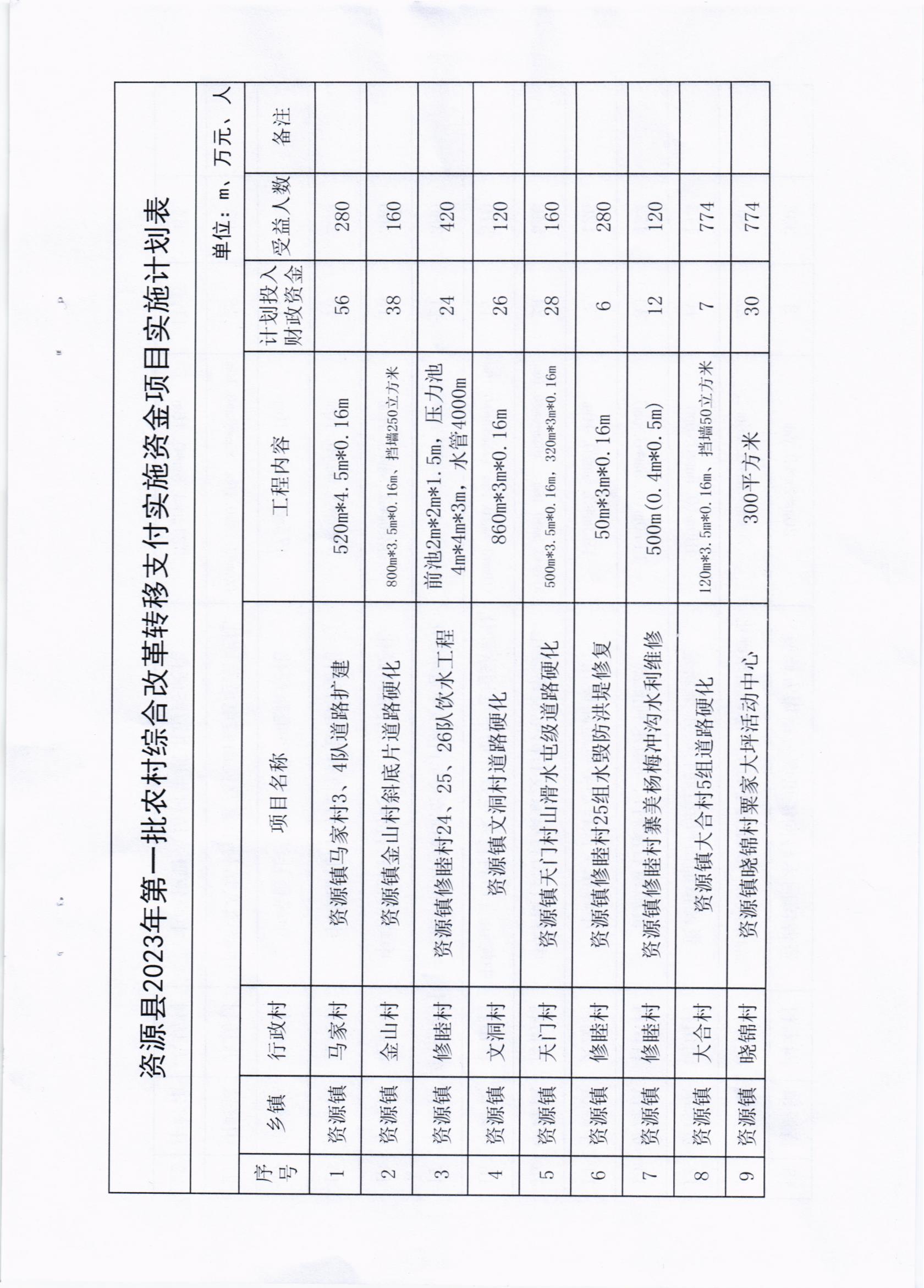 资源县人民政府关于资源县2023年第一批农村综合改革转移支付资金实施项目计划的批复