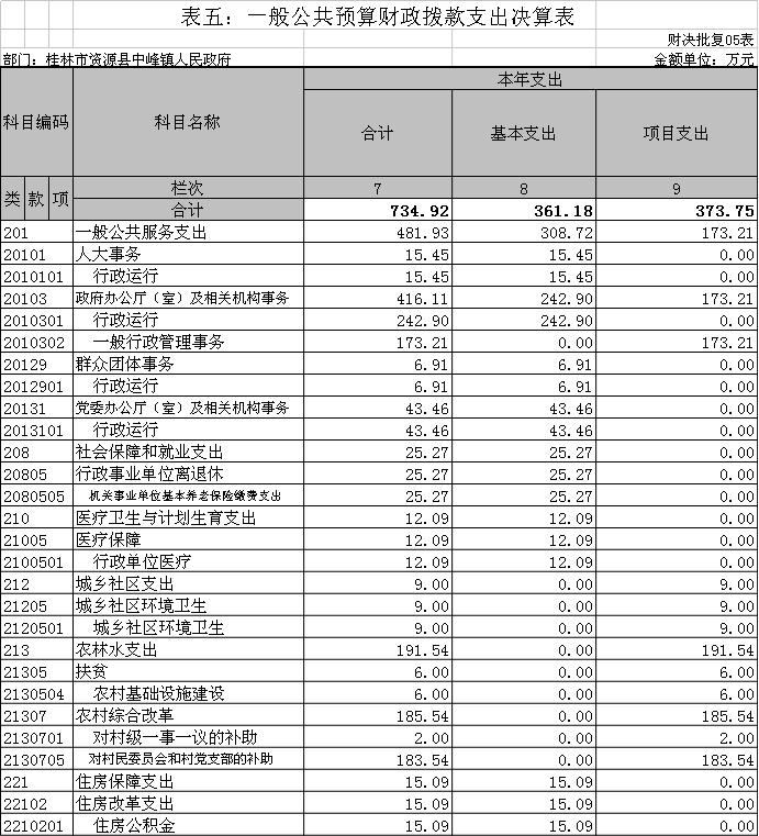 资源县中峰镇人民政府2016年度一般公共预算支出734.92万元,其中:基本支出361.18万元,项目支出373.75万元。