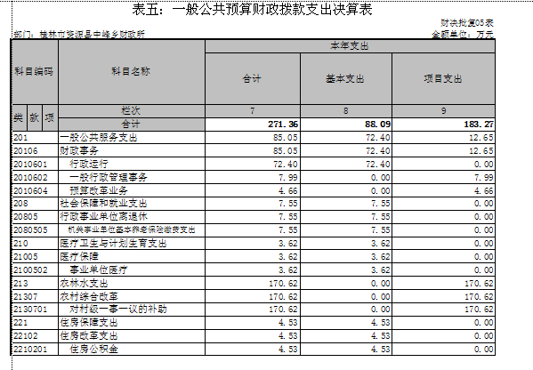 资源县财政局中峰财政所2016 年度一般公共预算支出271.36万元,其中:基本支出88.09万元,项目支出183.27万元。
