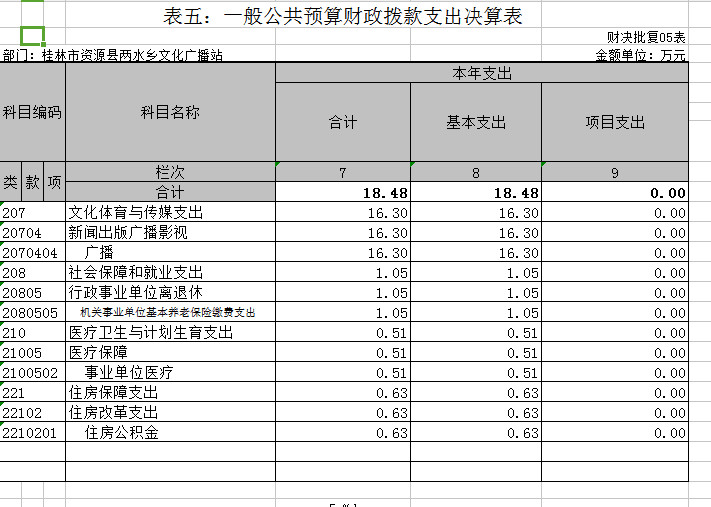 桂林市资源县两水乡文化广播站2016年度一般公共预算支出 18.48万元,其中:基本支出18.48万元,项目支出0万元。