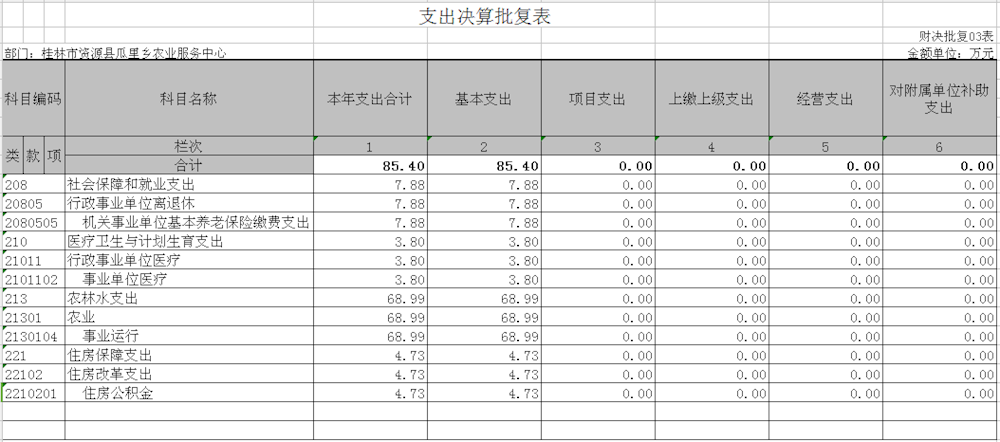 本年支出合计85.4万元,其中:基本支出 85.4元万,占100 %,按支出功能科目分项情况: