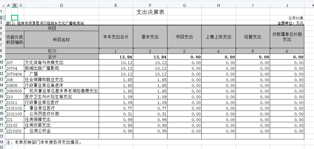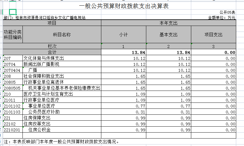 (二)资源县河口瑶族乡文化广播电视站2018年度总支出13.84万元,其中本年支出13.84万元, 较2017年度决算数增加0.16万元,增长1.15%。支出具体情况如下:
