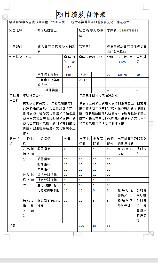 我部门根据年初设定的绩效目标,资源县河口瑶族乡文化广播电视站整体目标项目自评得分为85分。发现的主要问题及原因:一是支出不及时;二是操场灯泡容易坏,三是服务对象满意度。下一步改进措施:一是及时支付,保障工作正常运行;二是及时更换更耐用的灯泡,三是操场及时开灯,提高群众的满意度。