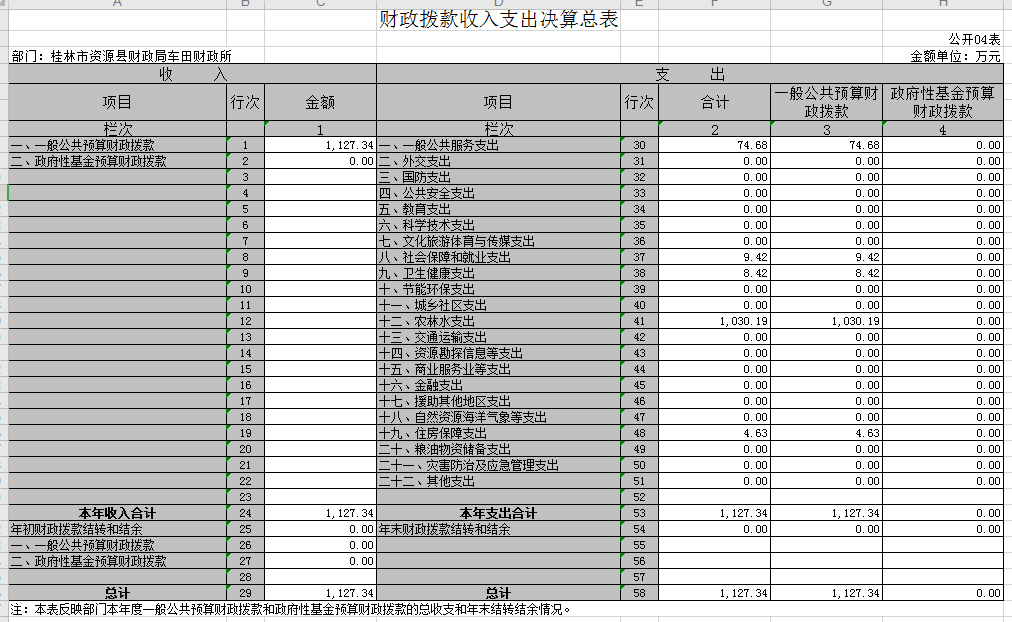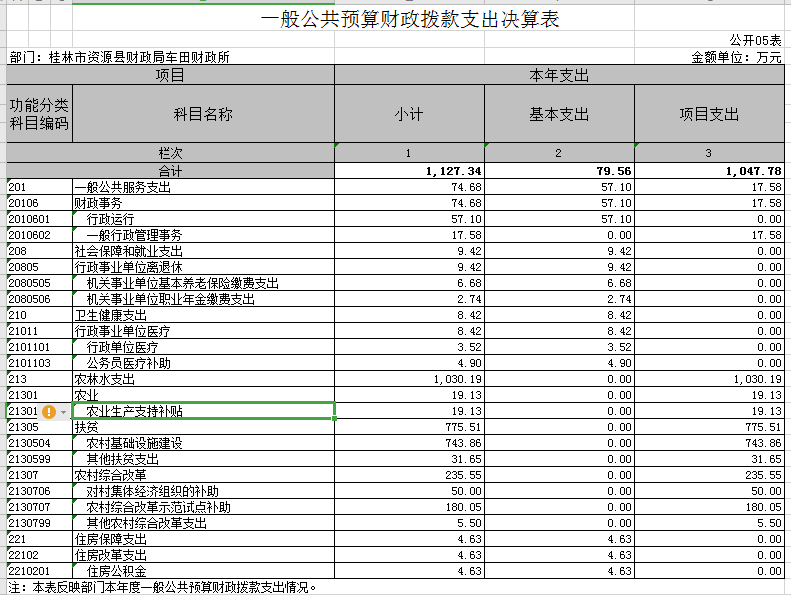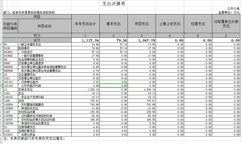 车田财政所2019年度一般公共预算支出1127.34万元,较2018年度决算数增加307.72万元,增长37.54%。其中:基本支出79.56万元,项目支出1047.78万元。