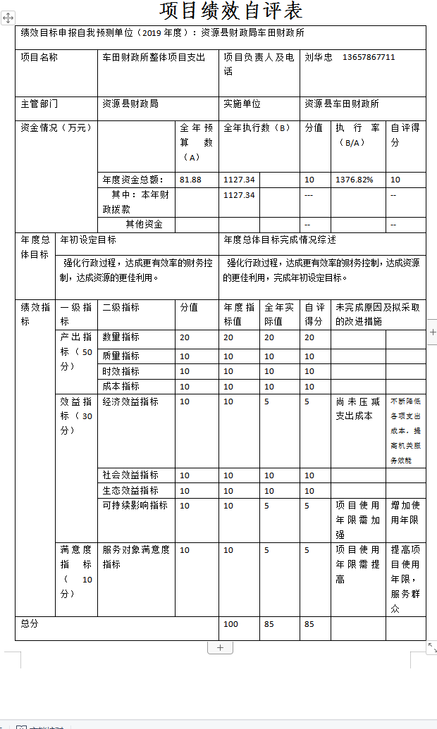 我部门根据年初设定的绩效目标,车田财政所整体目标项目自评得分为85分。发现的主要问题及原因:一是各项支出成本;二是可持续影响数年以上;三是服务对象满意度。下一步改进措施:一是不断降低各项支出成本,提高机关服务效能;二是提高项目使用年限,保障项目(基础设施)使用达到10年以上;三是提高基础设施使用年限,提高群众的满意度。