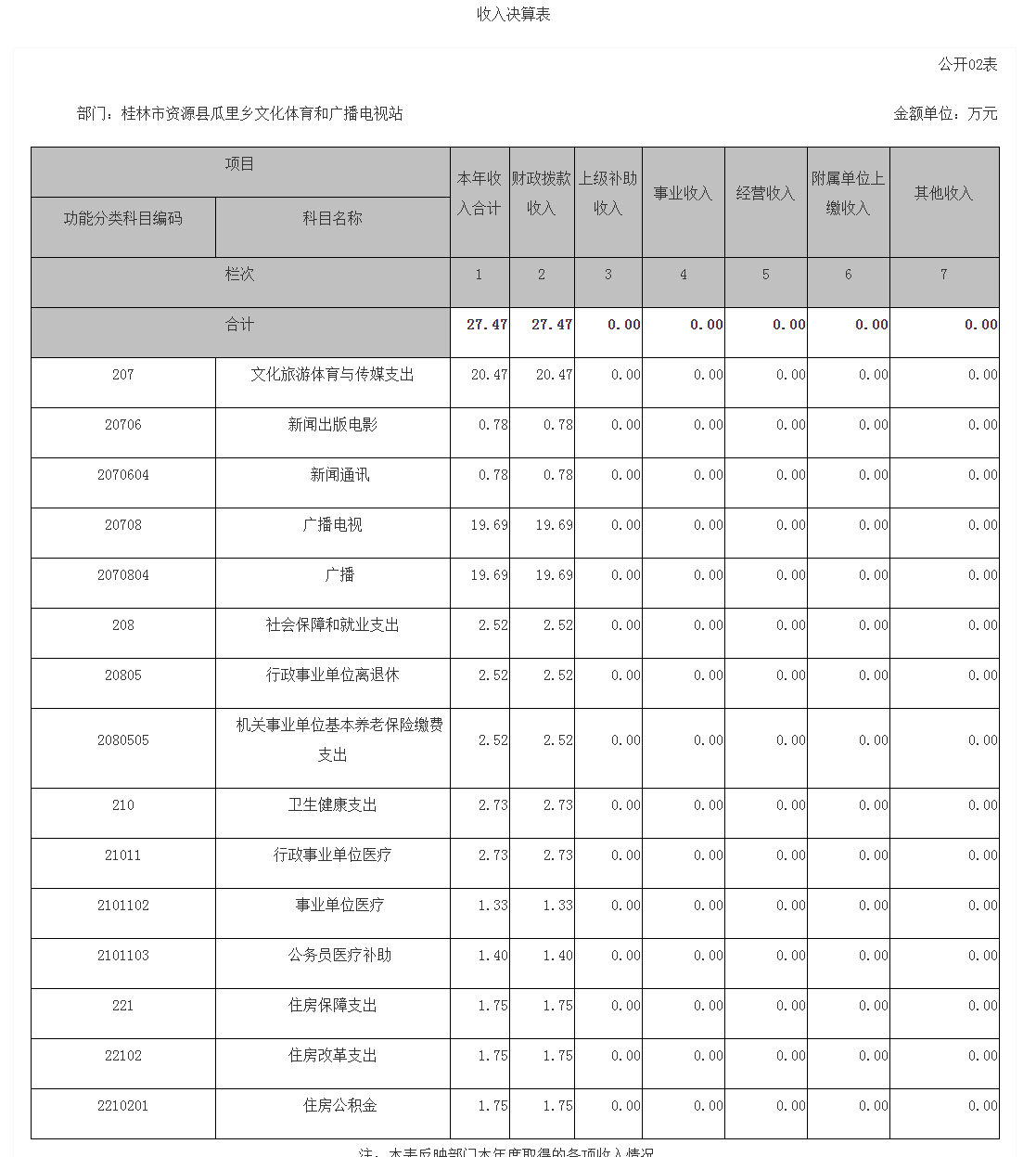 (一)桂林市资源县瓜里乡文化体育和广播电视站2019年度总收入27.47万元,其中本年收入27.47万元, 较2018年度决算数增加23.37万元,增长10.55%。收入具体情况如下。