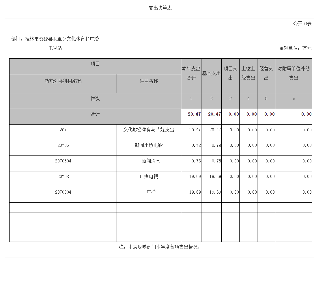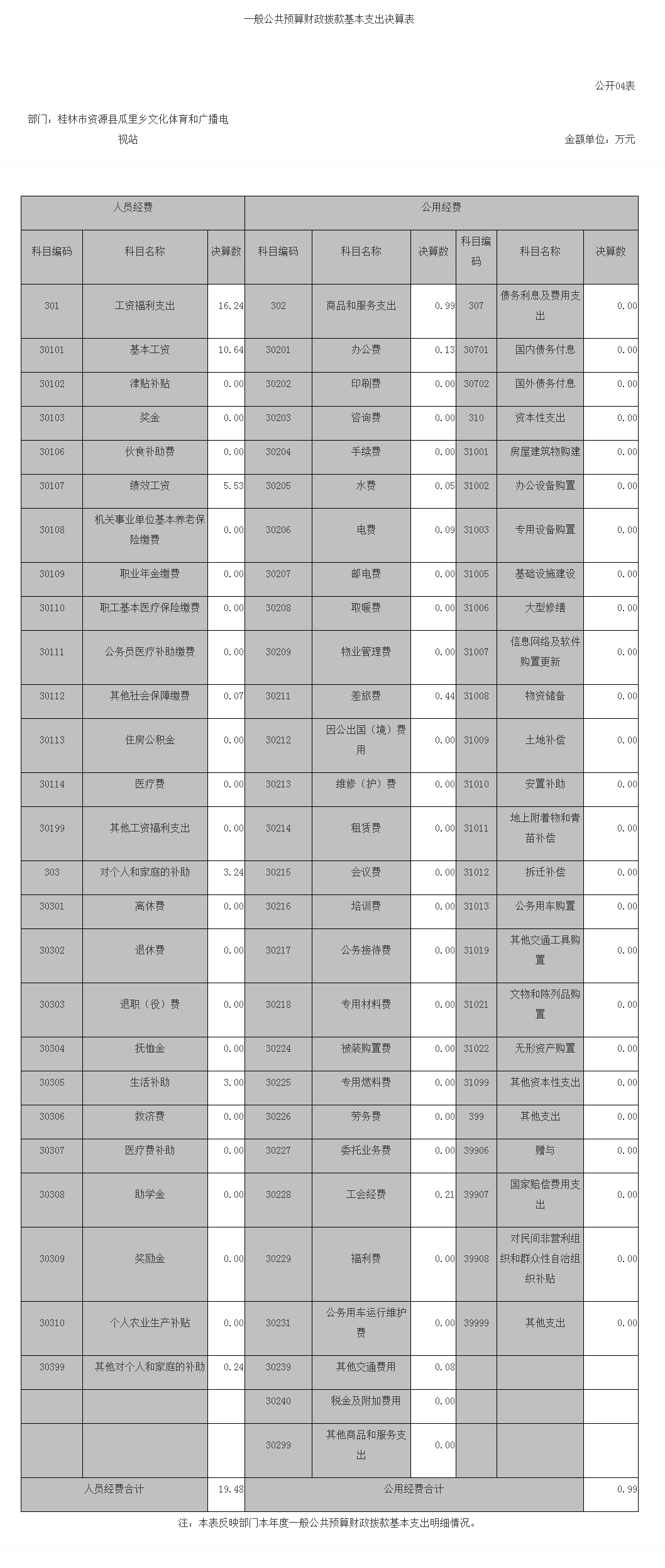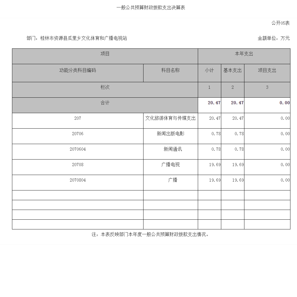 (二)桂林市资源县瓜里乡文化体育和广播电视站2019年度总支出 20.47 万元,其中本年支出 20.47万元, 较2018年度决算数减少2.9万元,下降12.4%。支出具体情况如下:人员经费支出19.48万元,公用经费支出0.99万元。