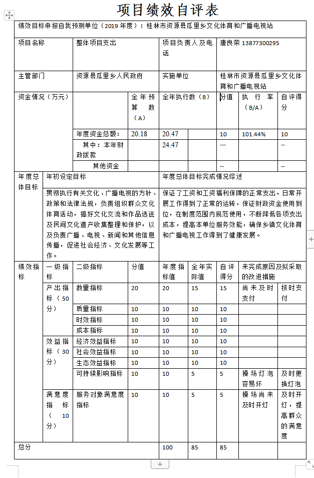 我部门根据年初设定的绩效目标,桂林市资源县瓜里乡文化体育和广播电视站整体目标项目自评得分为85分。发现的主要问题及原因:一是支出不及时;二是操场灯泡容易坏,三是服务对象满意度。下一步改进措施:一是及时支付,保障工作正常运行;二是及时更换更耐用的灯泡,三是操场及时开灯,提高群众的满意度。