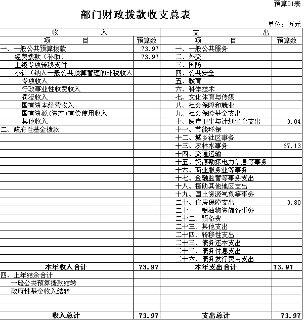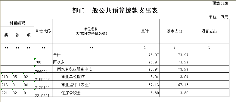 两水乡农业服务中心 2016 年财政拨款收支总预算 73.97万元。收入全部为一般公共预算拨款,无政府性基金预算拨款,包括:一般公共预算当年拨款收入 73.97万元;支出包括:农林水事务支出67.13万元、医疗卫生与计划生育支出3.04万元、住房保障支出3.80万元