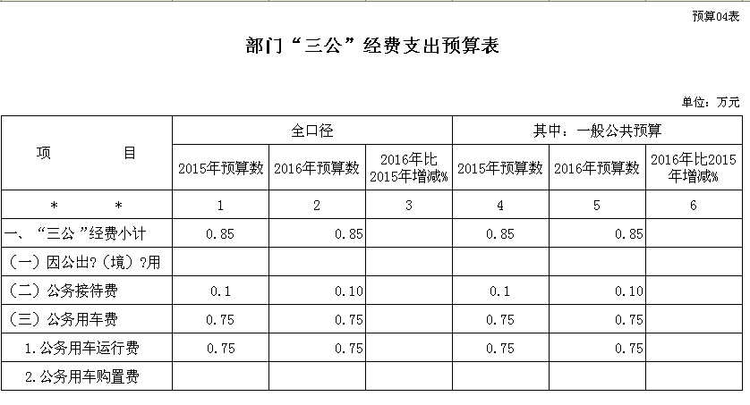 两水乡农业服务中心 2016 年“三公”经费预算数为 0.85万元,其中:公务用车购置及运行 费 0.75 万元,公务接待费 0.1 万元。2016 年“三公” 经费预算与 2015 年持平。
