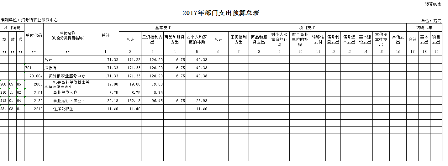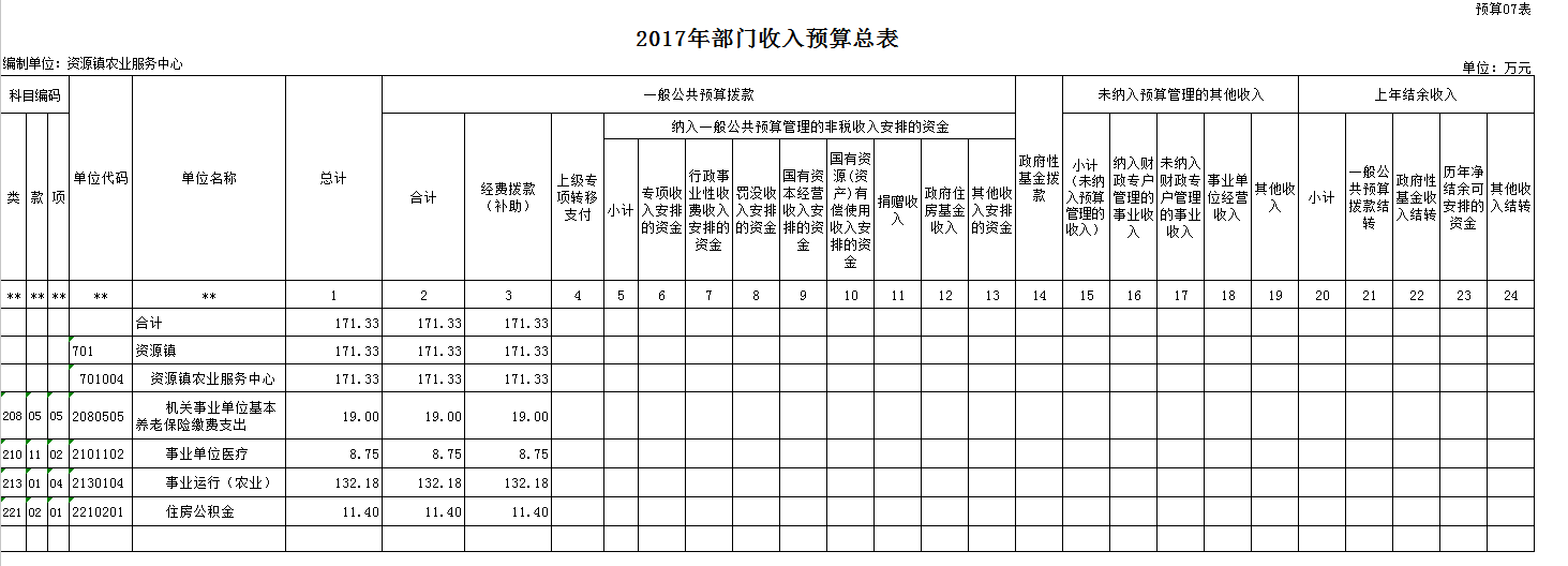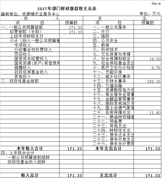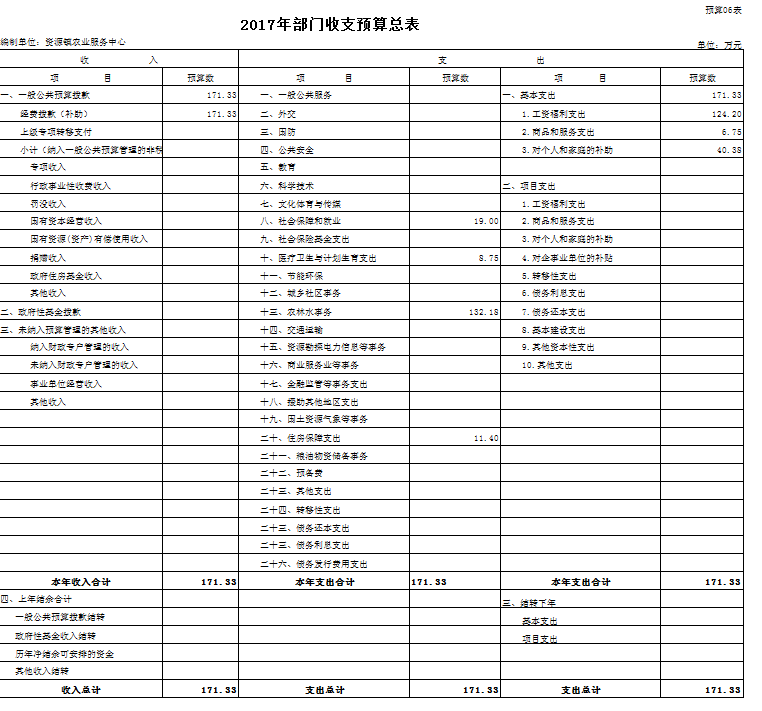 按照综合预算的原则,我单位所有收入和支出均纳入部门预算管理。我单位2017年全口径预算收支 171.33 万元,收入预算中:一般公共预算当年拨款收入 171.33 万元;政府性基金预算当年拨款收入 0 万元;未纳入预算管理的其他收入 0 万元,其他收入 0 万元,上年结转 0 万元。2017年支出总计 171.33 万元,其中:社会保障和就业19 万元;医疗卫生与计划生育支出 8.75 万元;农林水事务 132.18 万元;住房保障支出 11.4 万元。