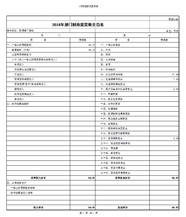 我单位2018年财政拨款收支预算 52.47 万元。收入预算中:一般公共预算拨款52.47万元,上年结转结余52.47万元。支出包括:一般公共服务0 万元;文化体育与传媒37.55 万元;社会保障和就业 7.24万元;医疗卫生与计划生育支出3.33万元;商业服务业等事务0万元;住房保障支出4.35万元。