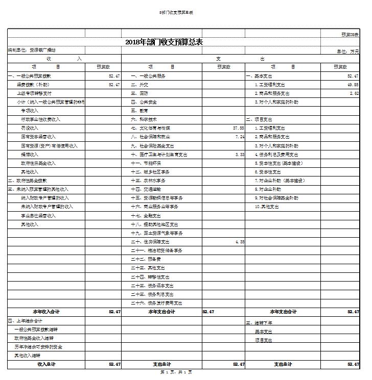 按照综合预算的原则,我单位所有收入和支出均纳入部门预算管理。我单位2018年全口径预算收支52.47万元,收入预算中:一般公共预算当年拨款收入52.47 万元;政府性基金预算当年拨款收入 0万元;未纳入预算管理的其他收入 0万元,其他收入0万元,上年结转 0万元。2018年支出总计52.47万元,其中:文化体育与传媒37.55万元;社会保障和就业 7.24万元;医疗卫生与计划生育支出 3.33 万元;住房保障支出4.35万元。