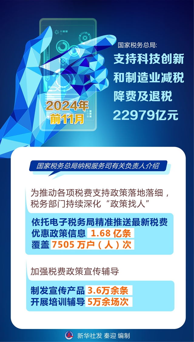 国家税务总局1月6日发布的数据显示,2024年前11个月,我国支持科技创新和制造业发展的主要政策减税降费及退税22979亿元。