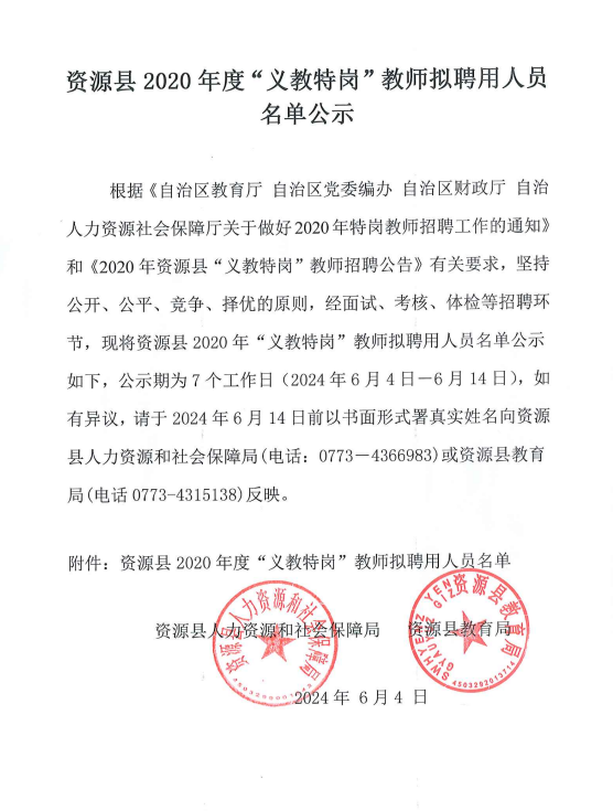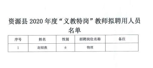 资源县2020年度“义教特岗”教师拟聘用人员名单公示