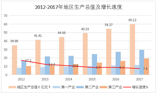 初步核实,全年地区生产总值60.12亿元,比上年增长7.4%。其中,第一产业增加值11.49亿元,增长5.1%;第二产业增加值29.34 亿元,增长3.3%;第三产业增加值19.29亿元,增长15.9%。第一产业增加值占国内生产总值的比重为19.1%,第二产业增加值比重为48.8%,第三产业增加值比重为32.1%。
