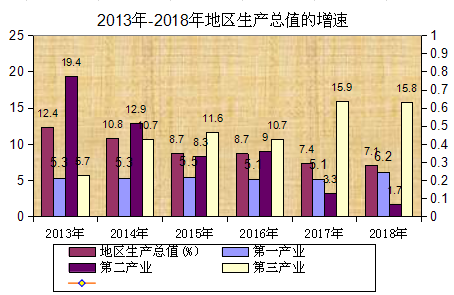 2018年初步核算,全年地区生产总值比上年增长 7.1 %。其中,第一产业增加值增长 6.2 %;第二产业增加值增长1.7 %;第三产业增加值增长 15.8 %。第一产业增加值占国内生产总值的比重为 19.76%,第二产业增加值比重为 42.59 %,第三产业增加值比重为37.65 %。