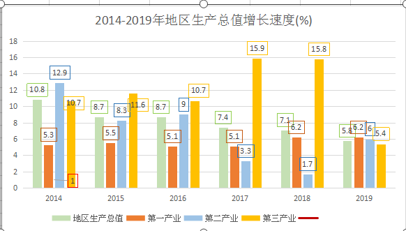 2019年初步核算,全年地区生产总值比上年增长 5.8 %。其中,第一产业增加值增长 6.2 %;第二产业增加值增长 6.0 %;第三产业增加值增长5.4 %。第一产业增加值占国内生产总值的比重为 33.5 %,第二产业增加值比重为 14.8 %,第三产业增加值比重为 51.7 %。