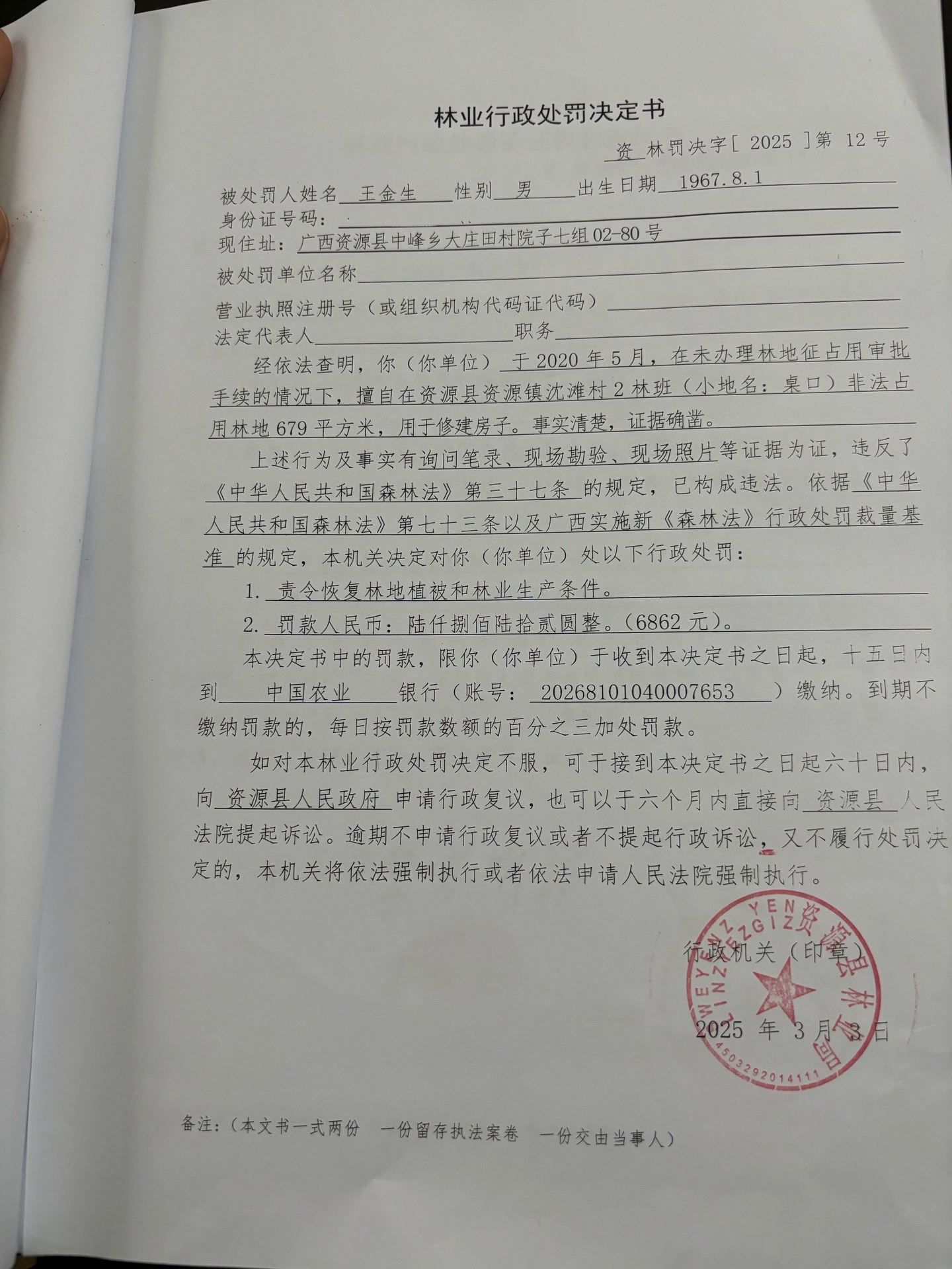 林业行政处罚决定书(王金生)