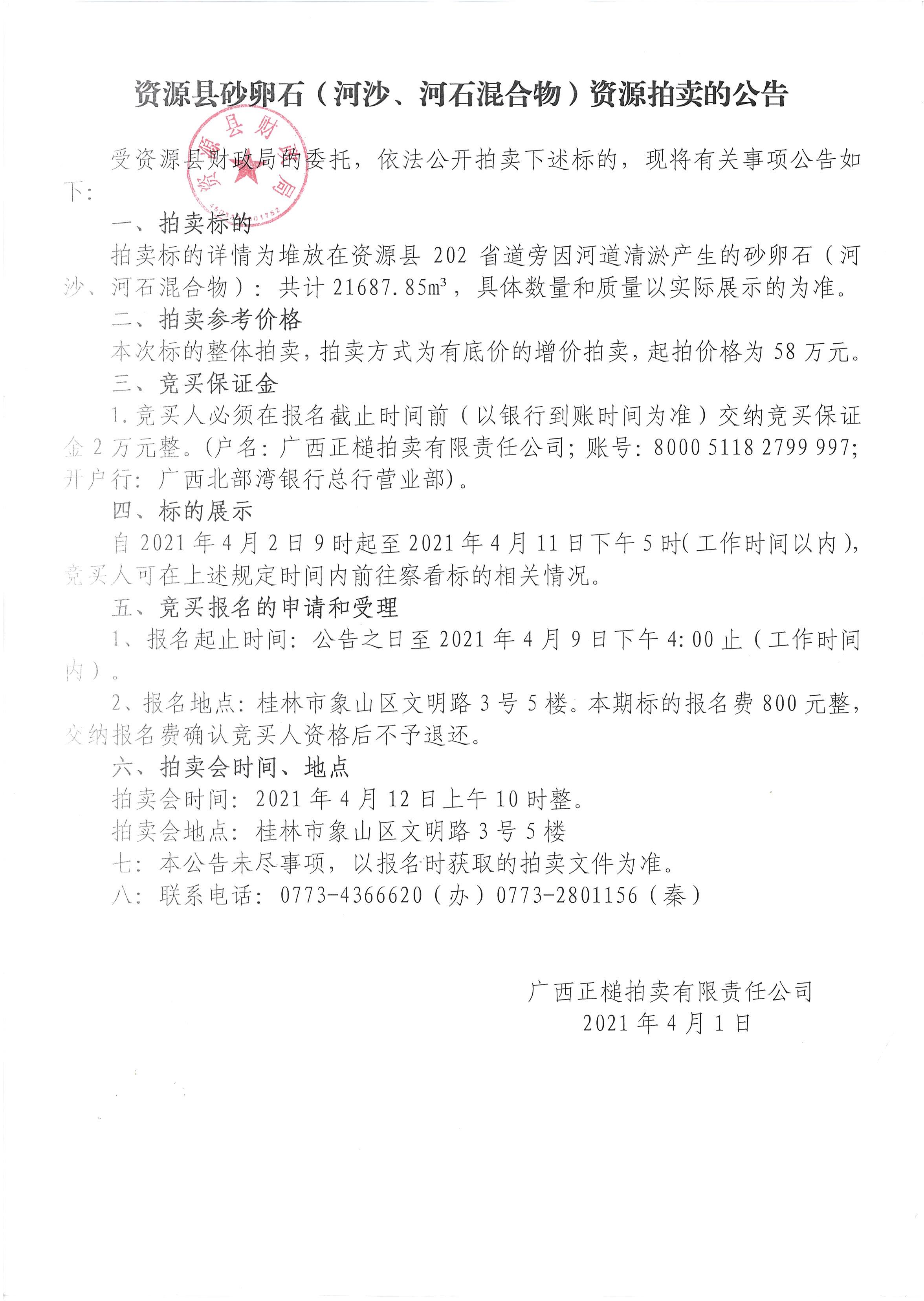 资源县砂卵石(河沙、河石混合物)资源拍卖的公告