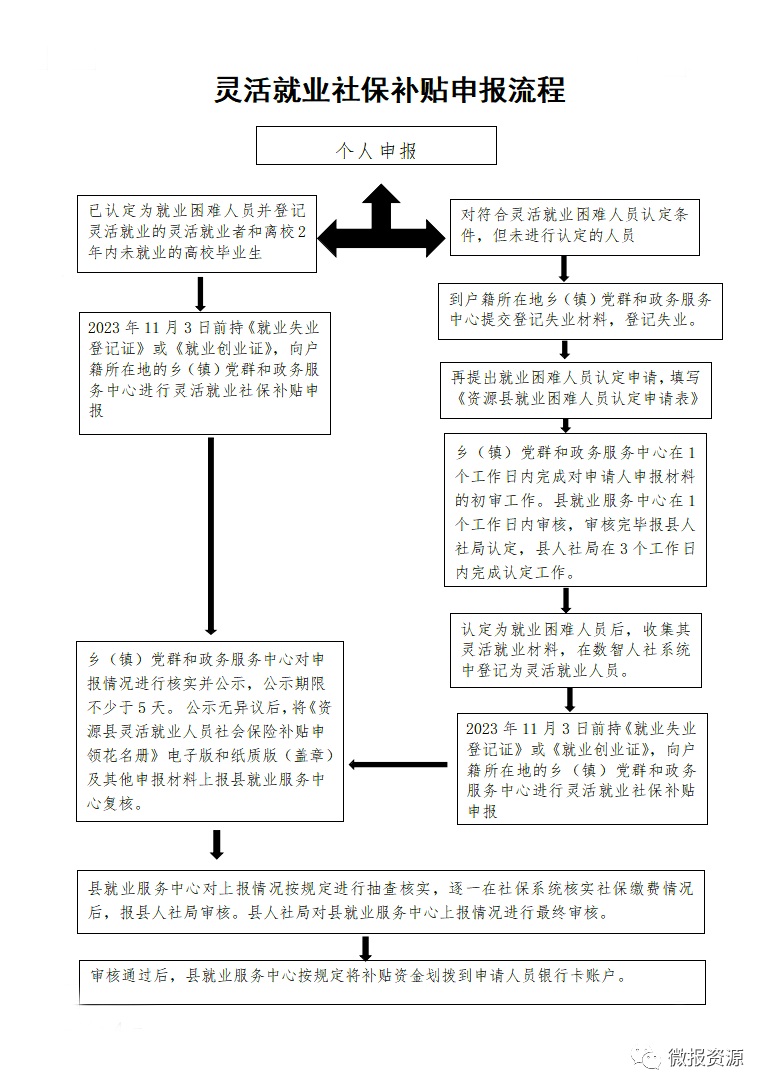 1.已认定为就业困难人员的灵活就业者和离校2年内未就业的高校毕业生在规定的申报时间内持《就业失业登记证》或《就业创业证》,向户籍所在地的乡(镇)党群和政务服务中心进行申报。居住所在地(或灵活就业所在地)在资源县县城范围内的,可直接向所属街道社区进行申报,由社区将申报材料统一移交资源镇党群和政务服务中心。