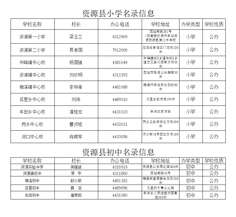 2023年资源县义务教育阶段学校名录信息