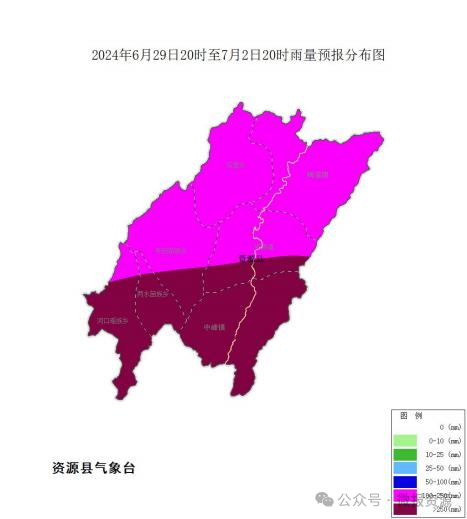根据目前气象资料分析,受高空槽、低涡切变及弱冷空气影响,预计6月30日至7月2日资源县有持续性暴雨到大暴雨、局部特大暴雨,并伴有短时雷暴大风等强对流天气。最强降雨时段在30日凌晨至7月1日。最大小时雨量70-90毫米。过程累计雨量:150-250毫米、局部300毫米以上(附图),本次过程降雨范围较广、降雨强度大、持续时间长,致灾风险高。具体预报如下: