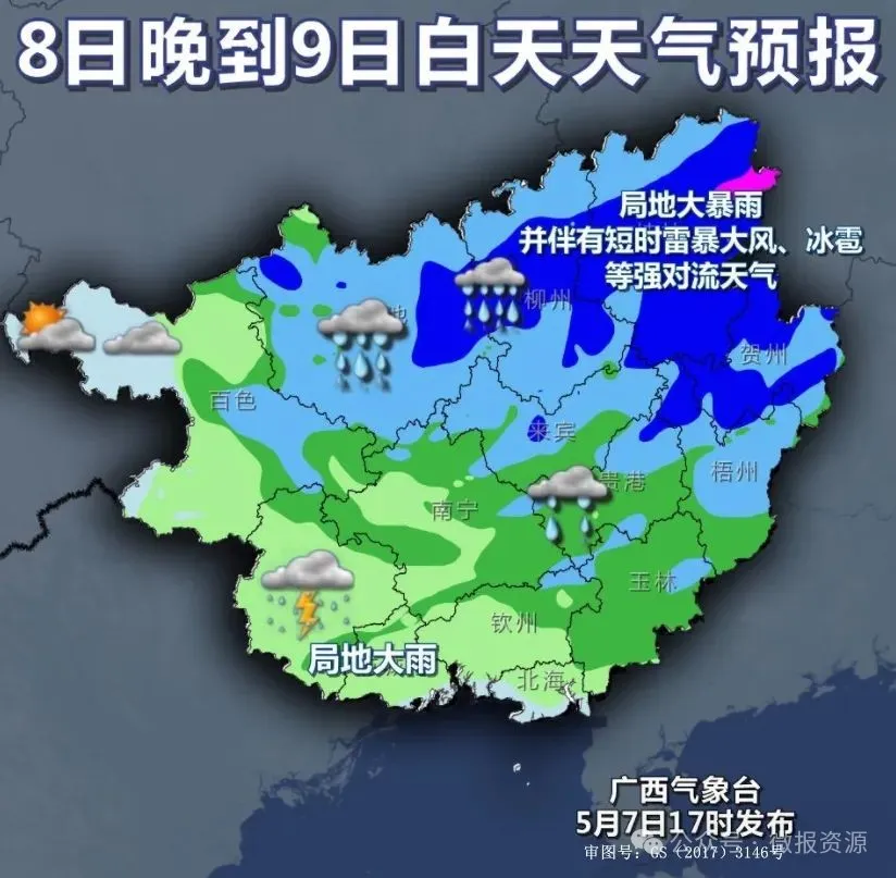 5月8日10时,广西气象台发布暴雨蓝色预警,预计: