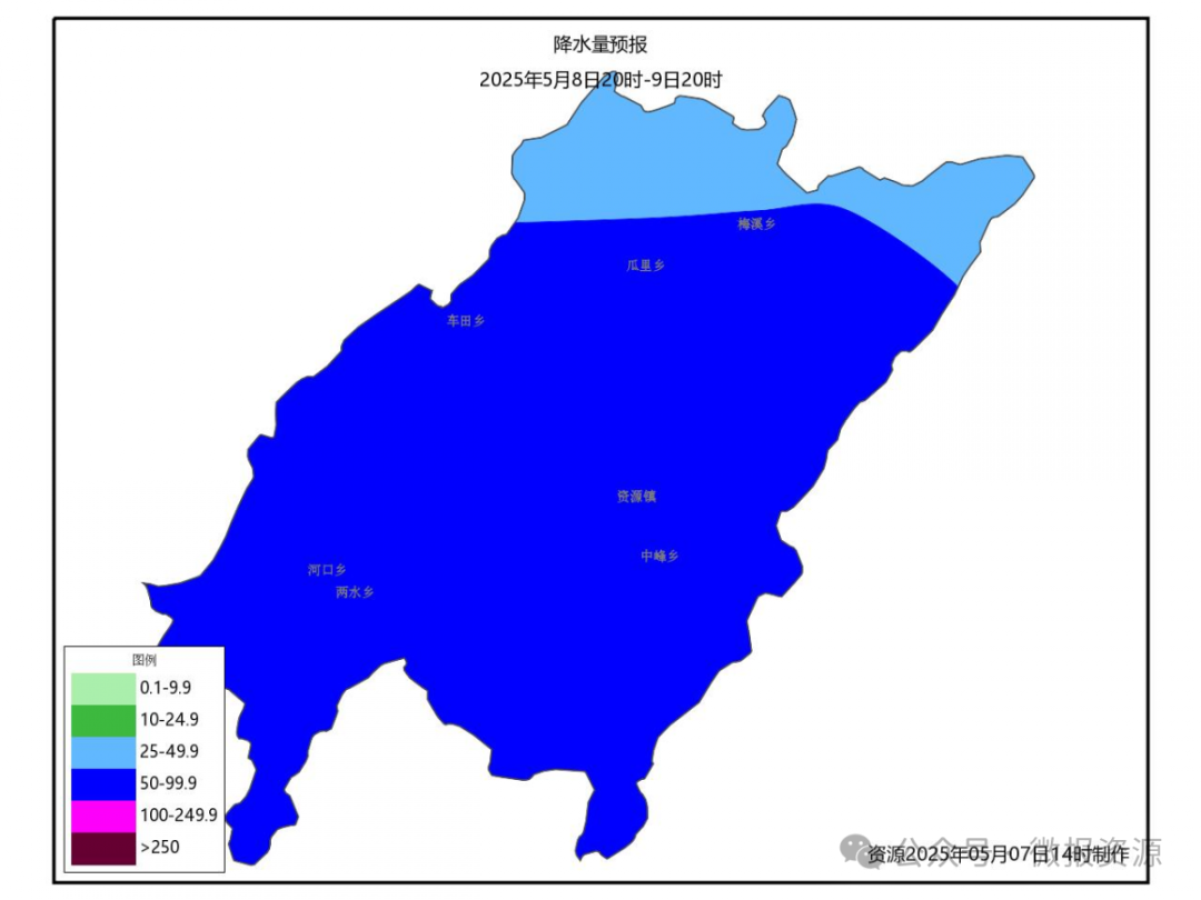 根据资源县气象资料分析,预计8日夜间至9日资源县将有一次强降雨天气过程,并伴有短时雷暴大风、冰雹等强对流天气。过程累计雨量40-60毫米、局部80毫米以上(附图),最大小时雨量20-40毫米。