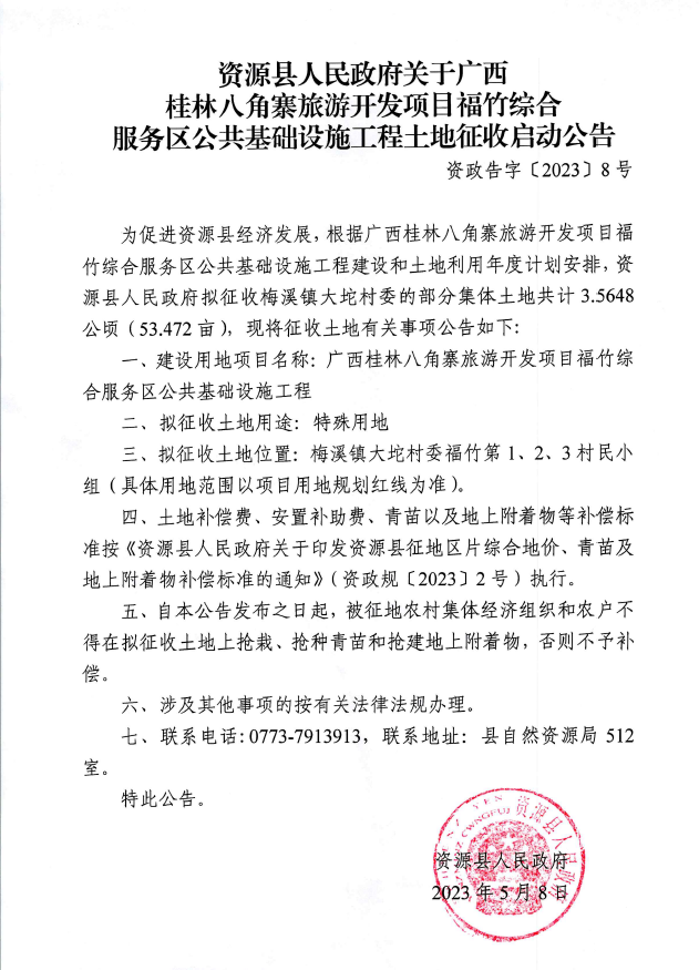 资源县人民政府关于广西桂林八角寨旅游开发项目福竹综合服务区公共基础设施工程土地征收启动公告