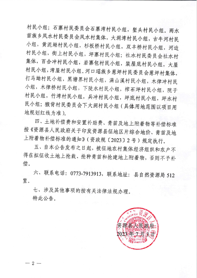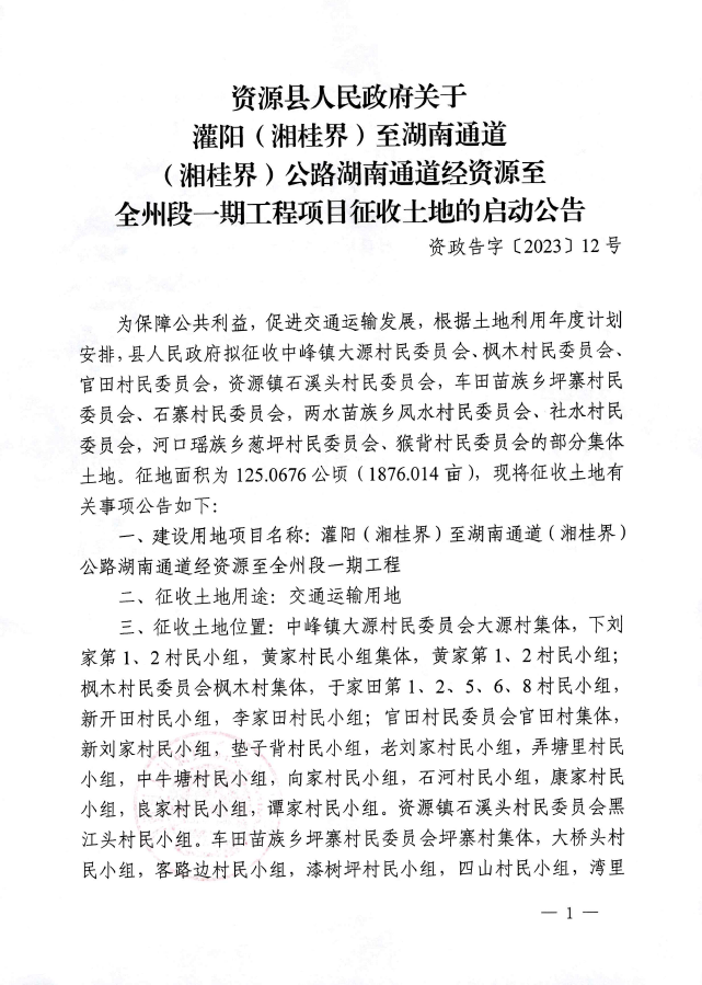 资源县人民政府关于灌阳(湘桂界)至湖南通道湘桂界 )公路湖南通道经资源至全州段一期工程项目征收土地的启动公告
