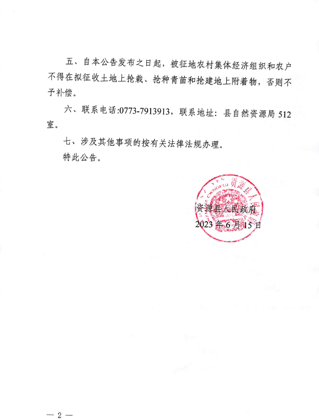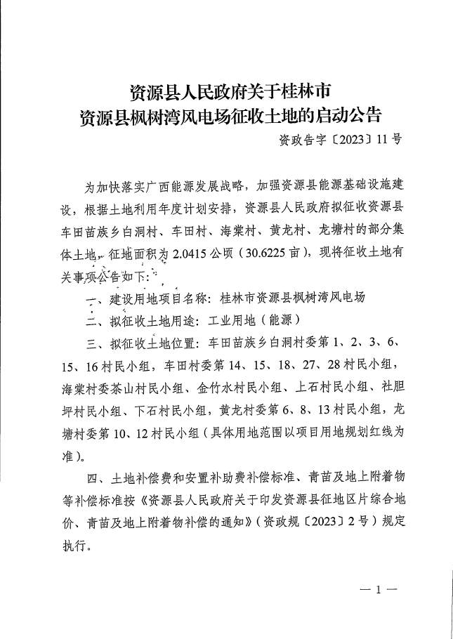 资源县人民政府关于桂林市资源县枫树湾风电场征收土地的启动公告