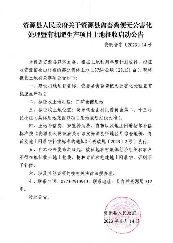 资源县人民政府关于资源县禽畜类便无公害化处理暨有机肥生产项目土地征收启动公告