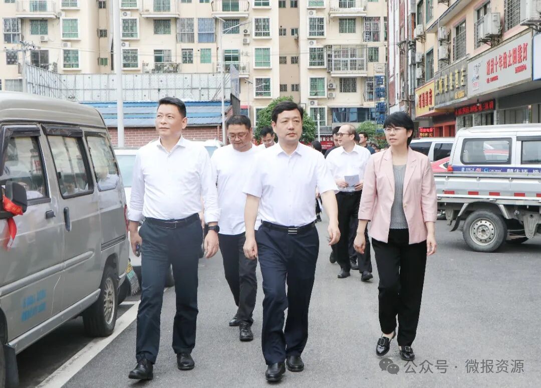 ▲自治区住房城乡建设厅党组书记、厅长杨绿峰(前排左二)率队在资源县城北体育馆周边城中村改造项目地调研。资源县委书记黄钦(左一),县委副书记、县长王凤玲(右一),县委常委、统战部部长李迅军(左二)陪同调研