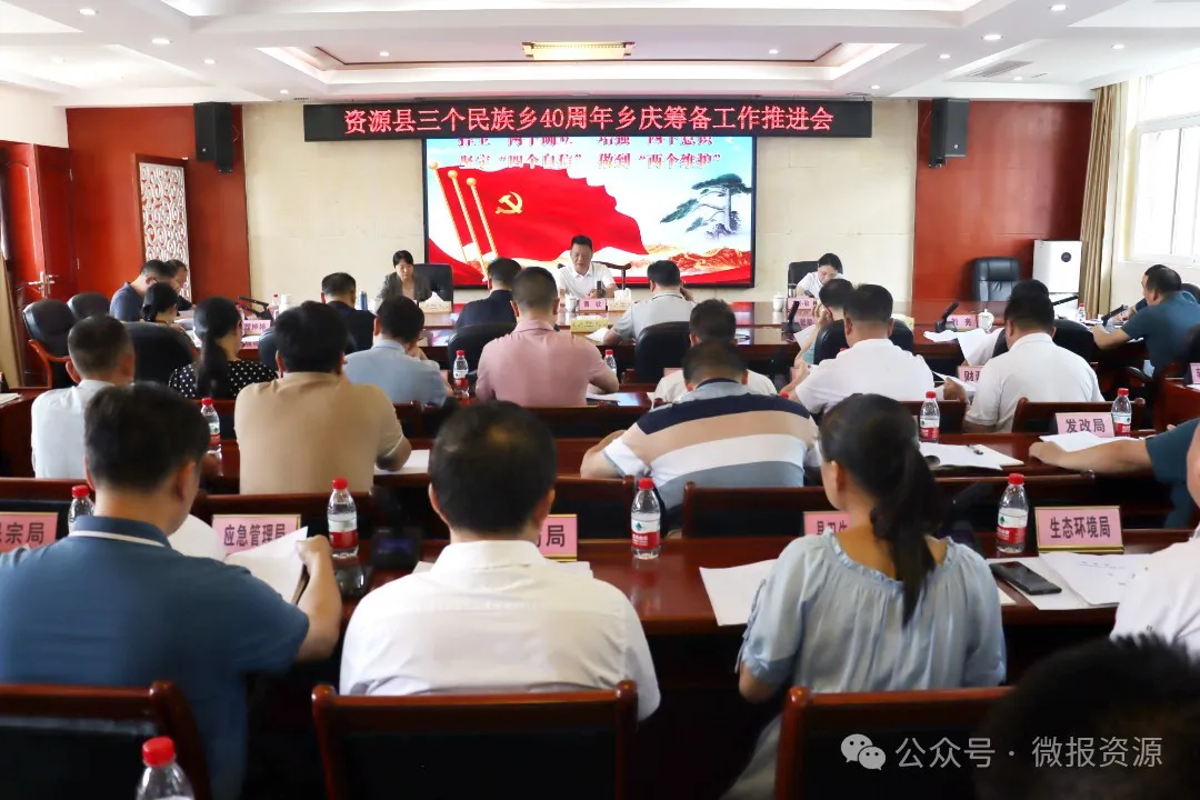 8月2日,资源县三个民族乡40周年乡庆筹备工作推进会在县行政中心622会议室召开,研究总结近期三个民族乡40周年乡庆筹备工作进展情况,就下一步乡庆重点工作、关键环节进行再细化、再落实、再推进。