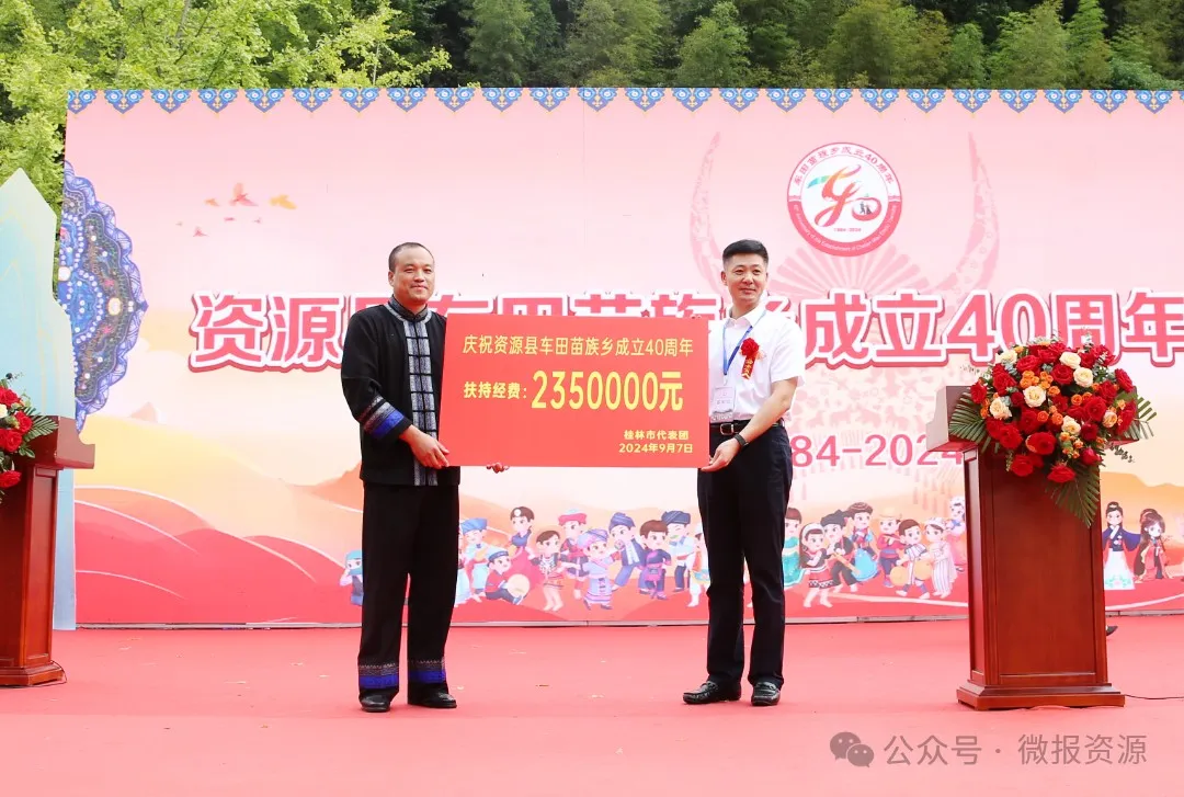 会上,桂林市代表团副团长、市委常委、副市长陈国富代表桂林市代表团向车田苗族乡赠送贺匾和扶持经费;资源县代表团副团长、县委副书记、县长王凤玲代表资源县代表团向车田苗族乡赠送贺匾和慰问金