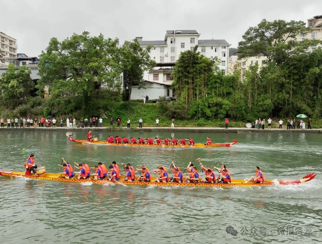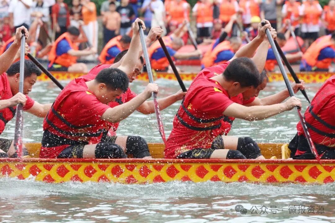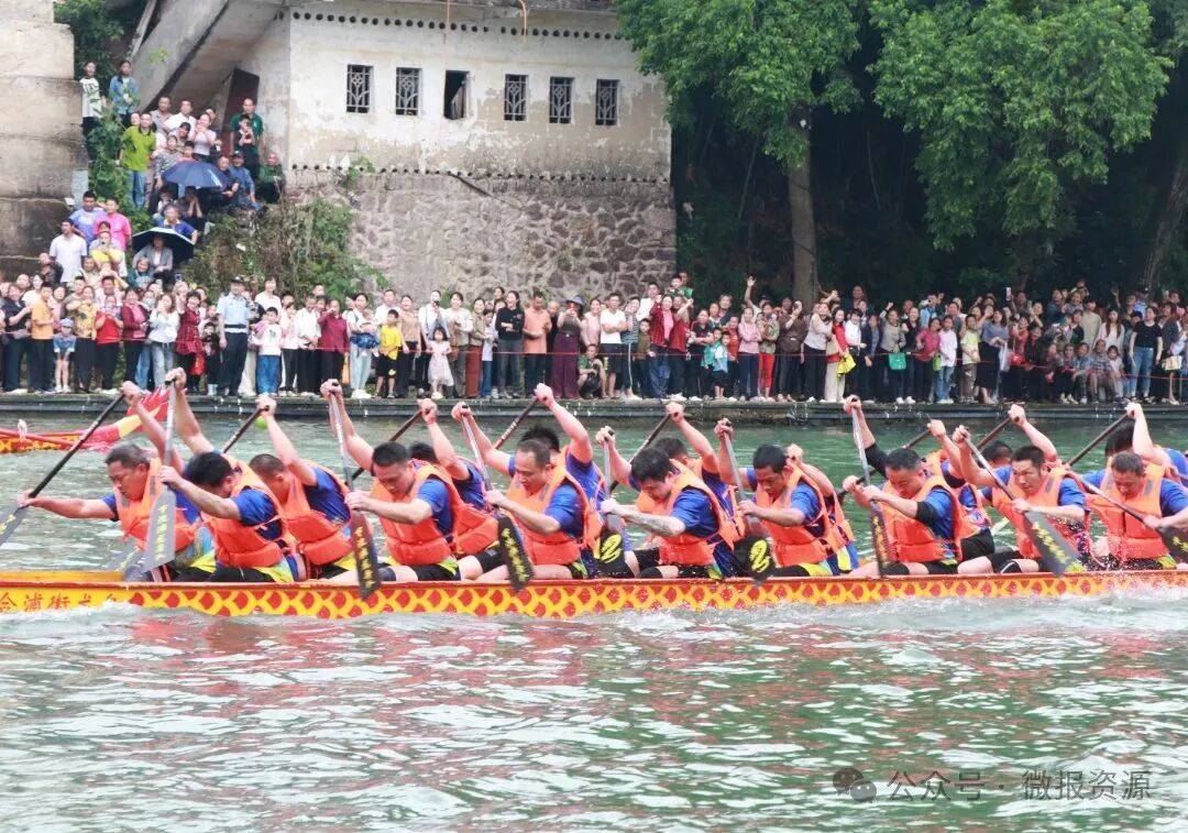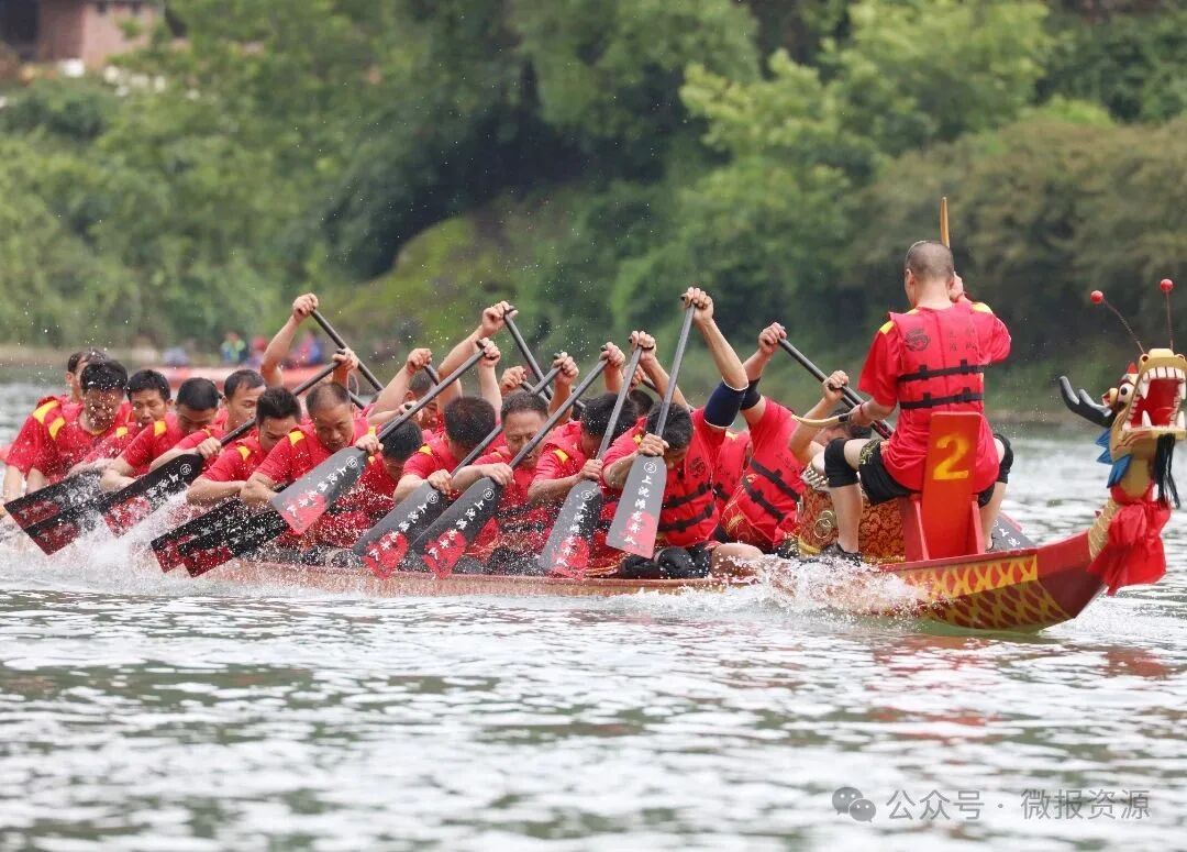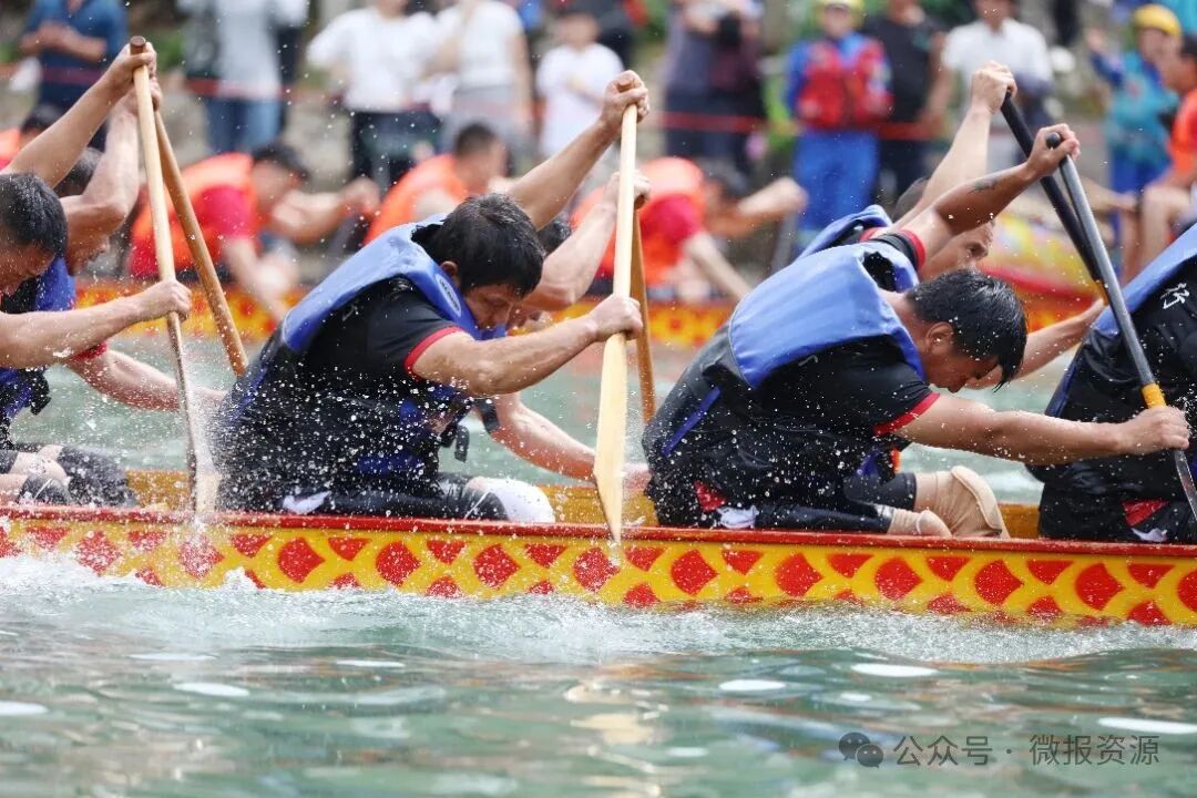 8支来自周边村镇的龙舟队伍齐聚在资江沈滩村江段,鲜艳的龙舟披红挂彩,蓄势待发。随着发令声响,桨手们动作整齐划一,伴随着震耳欲聋的鼓点和岸边如潮的呐喊,龙舟如离弦之箭破开水面,奋力向前冲刺。每一次整齐划桨都凝聚着团队协作的力量,每一次逆流而上都彰显着拼搏进取的精神,健儿们激情四射,上演了一场速度与力量、协作与意志的精彩对决。清澈的漓江源头之水被激昂的斗志搅动得沸腾起来。