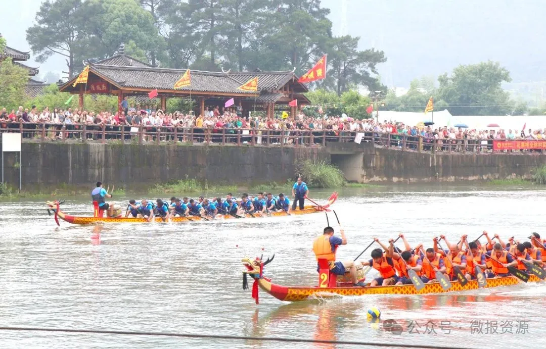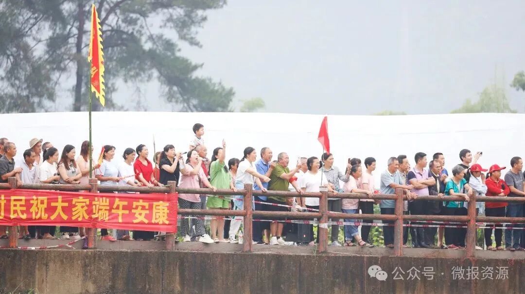 与此同时,资源镇八角亭至风雨桥河段的龙舟赛也在激烈进行,下沈滩、土地塘、旺田、大埠头等队伍正展开角逐。“一二!一二!”呐喊声与铿锵有力的鼓点交织,响彻湖面,龙舟你追我赶,每支队伍都全力以赴,力争上游。岸边围观群众里三层外三层,不少人还拿出手机,记录下这精彩瞬间。