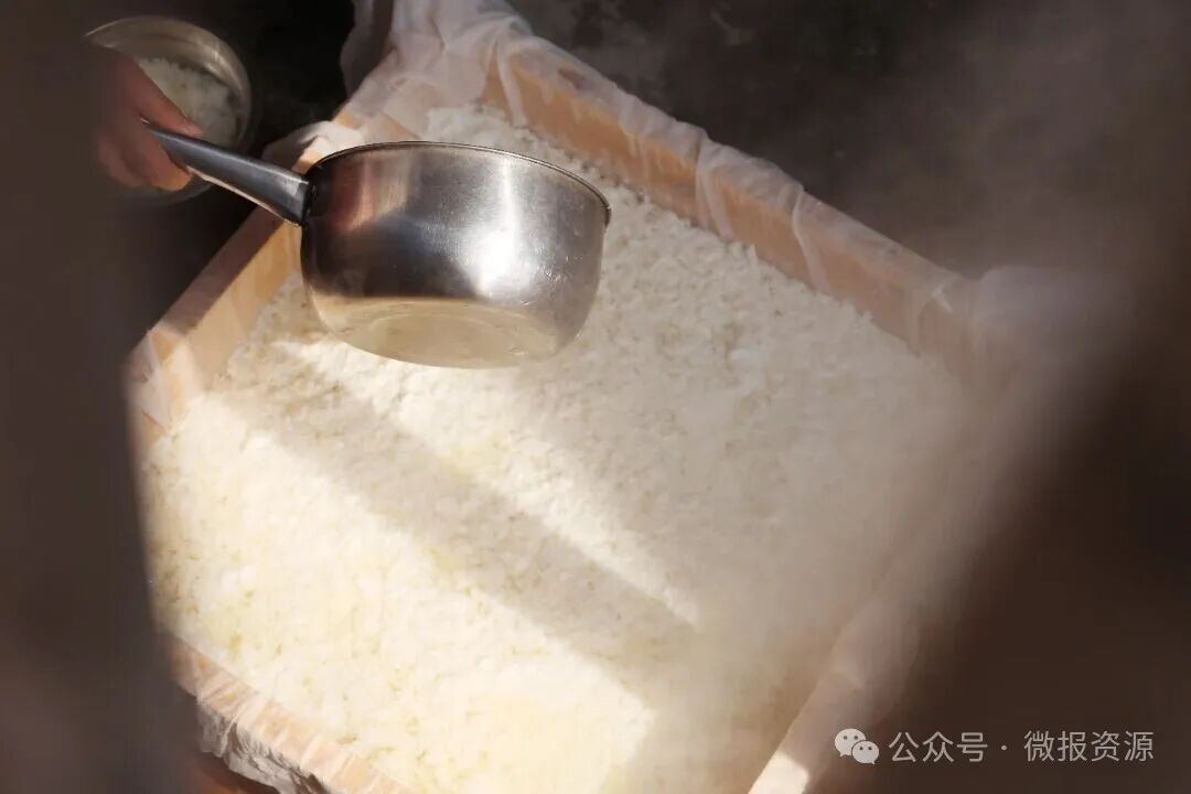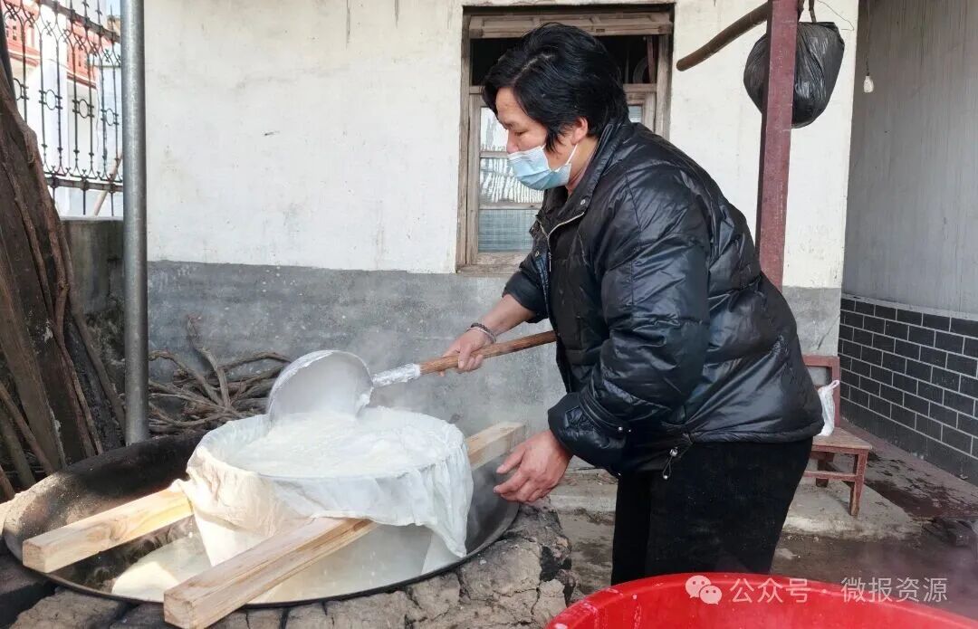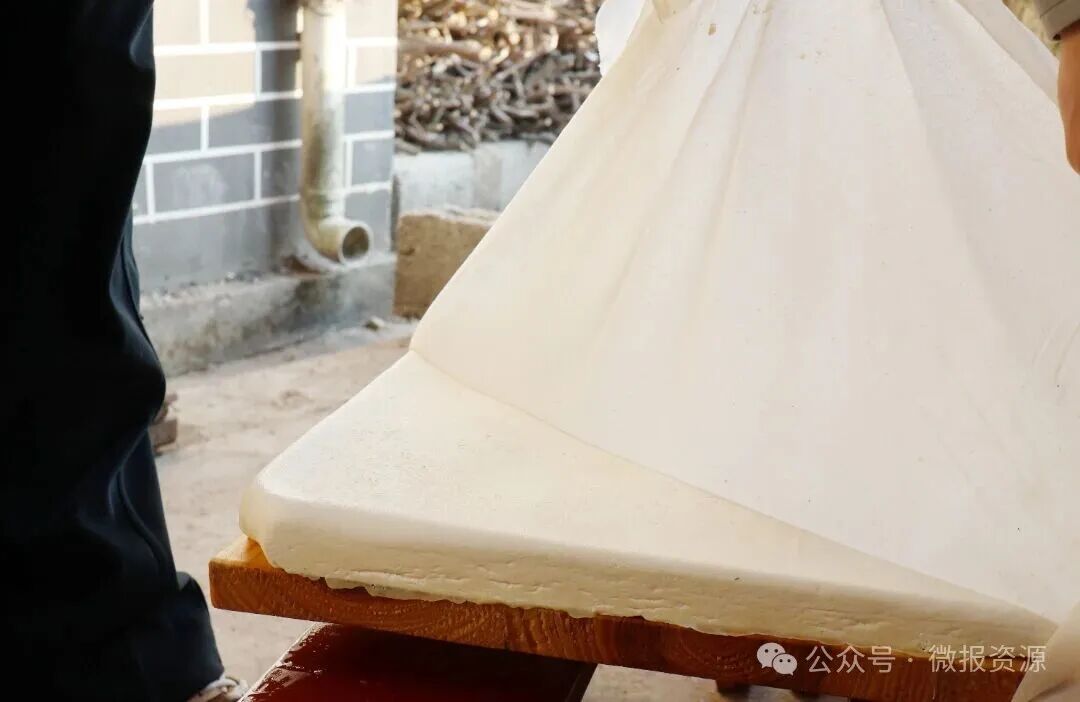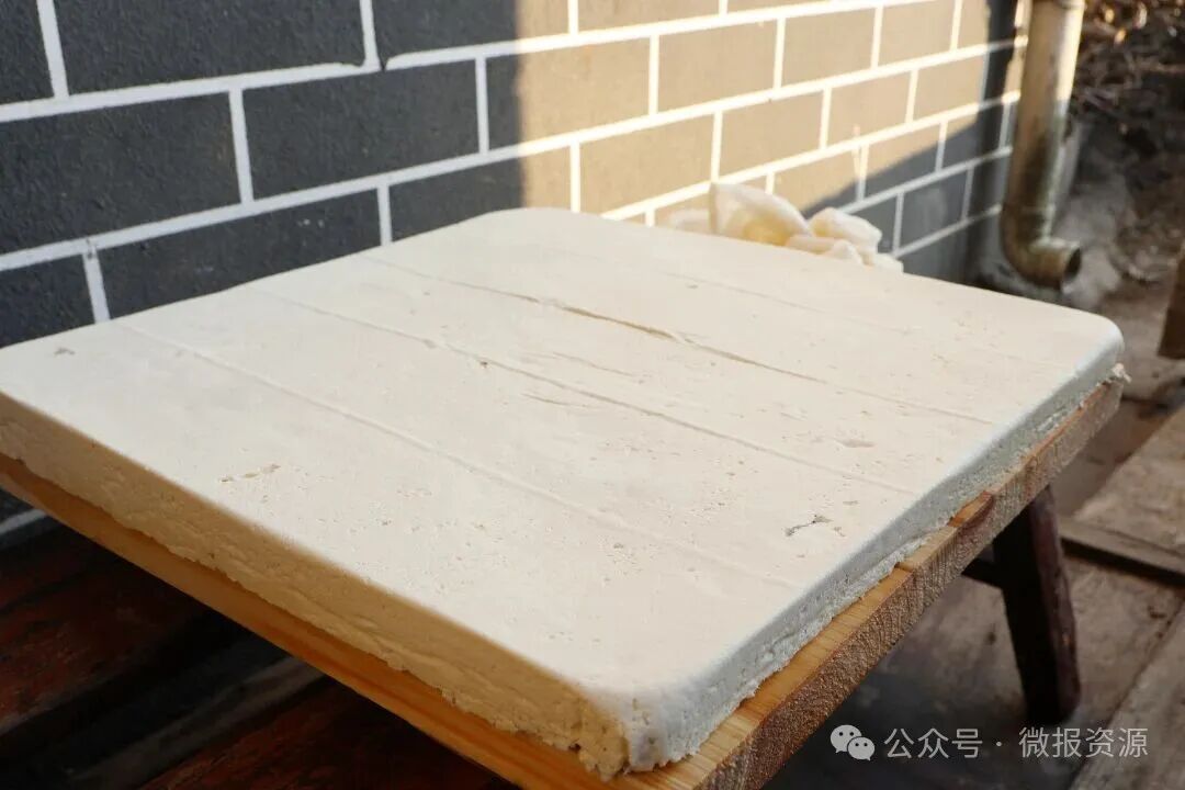待豆腐脑降温,刘大姐将其舀入铺好自家旧纱布的木框,裹紧纱布后盖上木板,压上一块沉甸甸的青石。“冬月压豆腐得久些,才能更紧实筋道,吃起来才有豆香回甘。”她擦了擦额头的汗,笑着说,这些豆子都是自己家种的,颗粒饱满,打出来的豆腐口感才够地道。